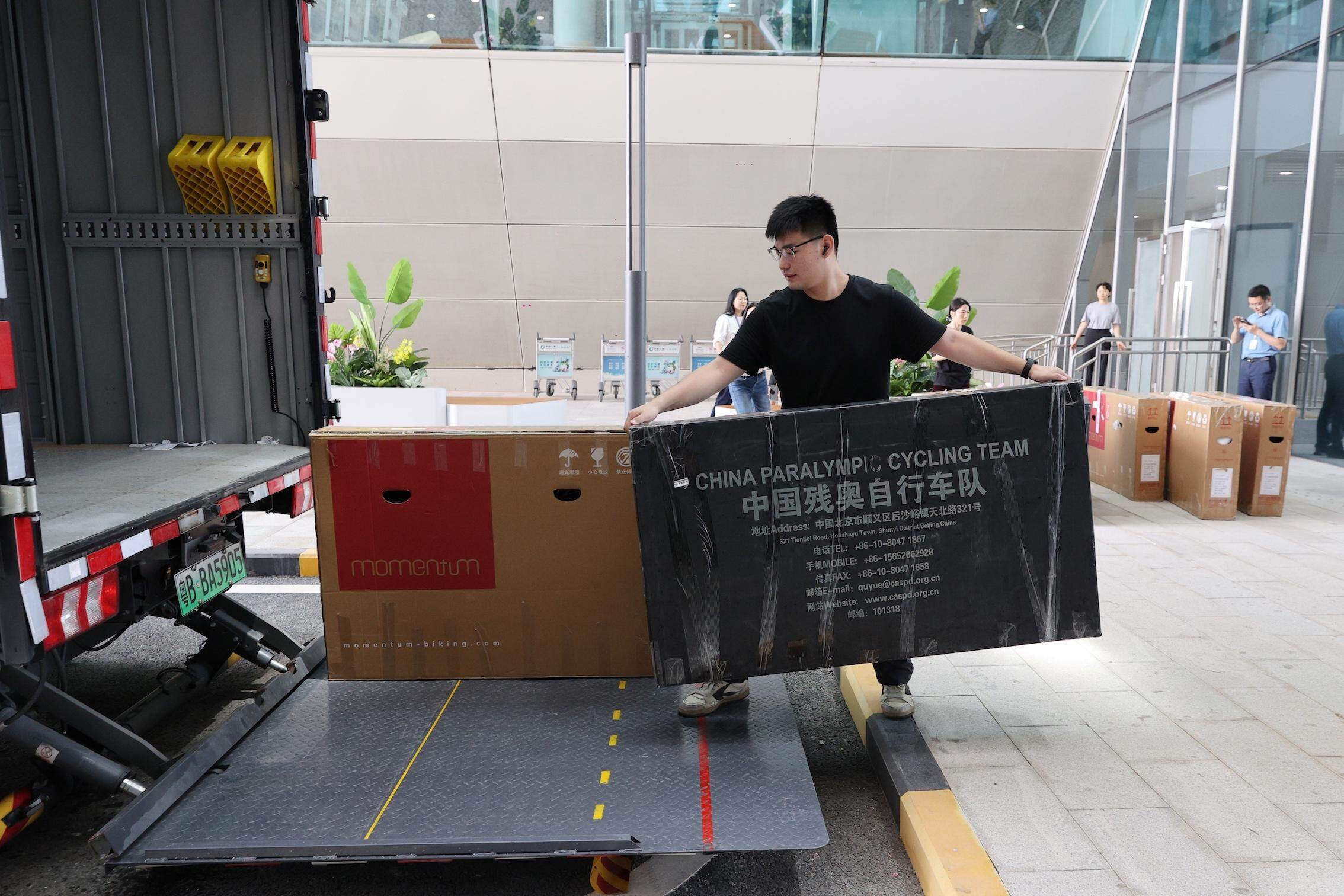 信息确认无误,志愿者们随即引导代表团通过无障碍电梯下楼,开往酒店的巴士和装载比赛装备的物流车已经在待命。