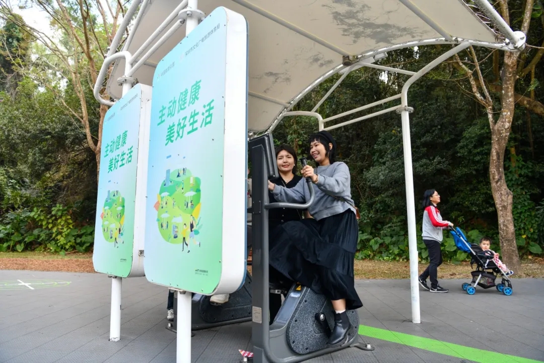 市民在深圳莲花山公园内的室外智能健身房参与体育锻炼