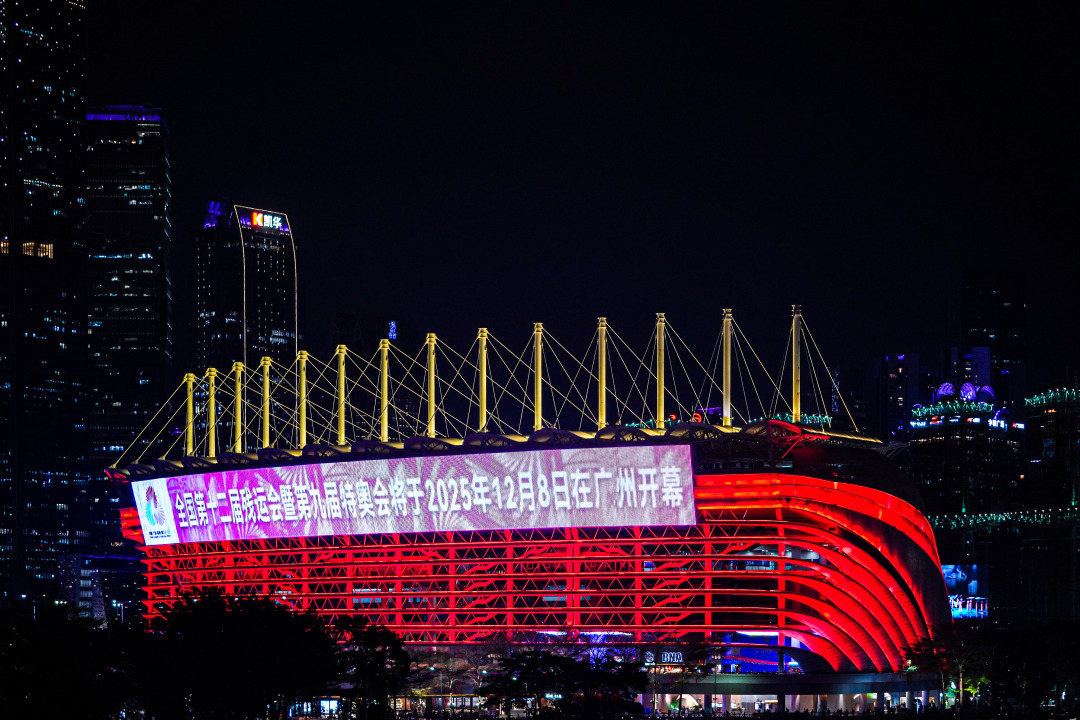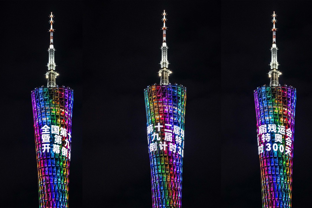 2月11日晚,随着夜幕降临,广州塔、海心沙等地标建筑亮起灯光,并打出“全国第十二届残运会暨第九届特奥会开幕倒计时300天”的字幕,在灯光璀璨的珠江两岸为残特奥会宣传、打call。本次残特奥会将于今年12月8日在广州开幕。