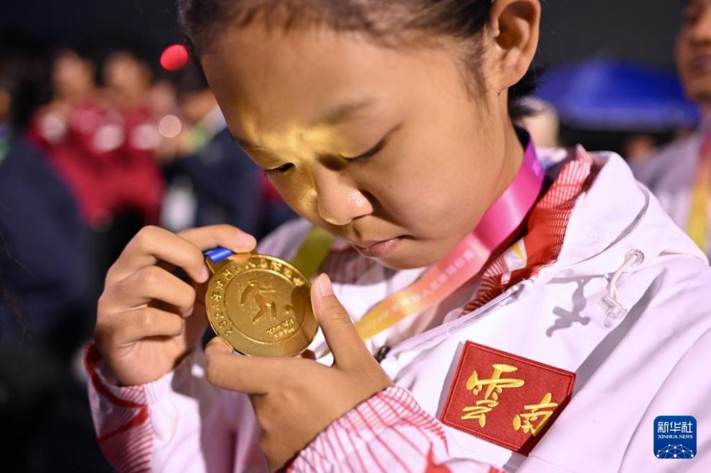 10月28日,获得女子组冠军的云南队球员在颁奖仪式后抚摸金牌。