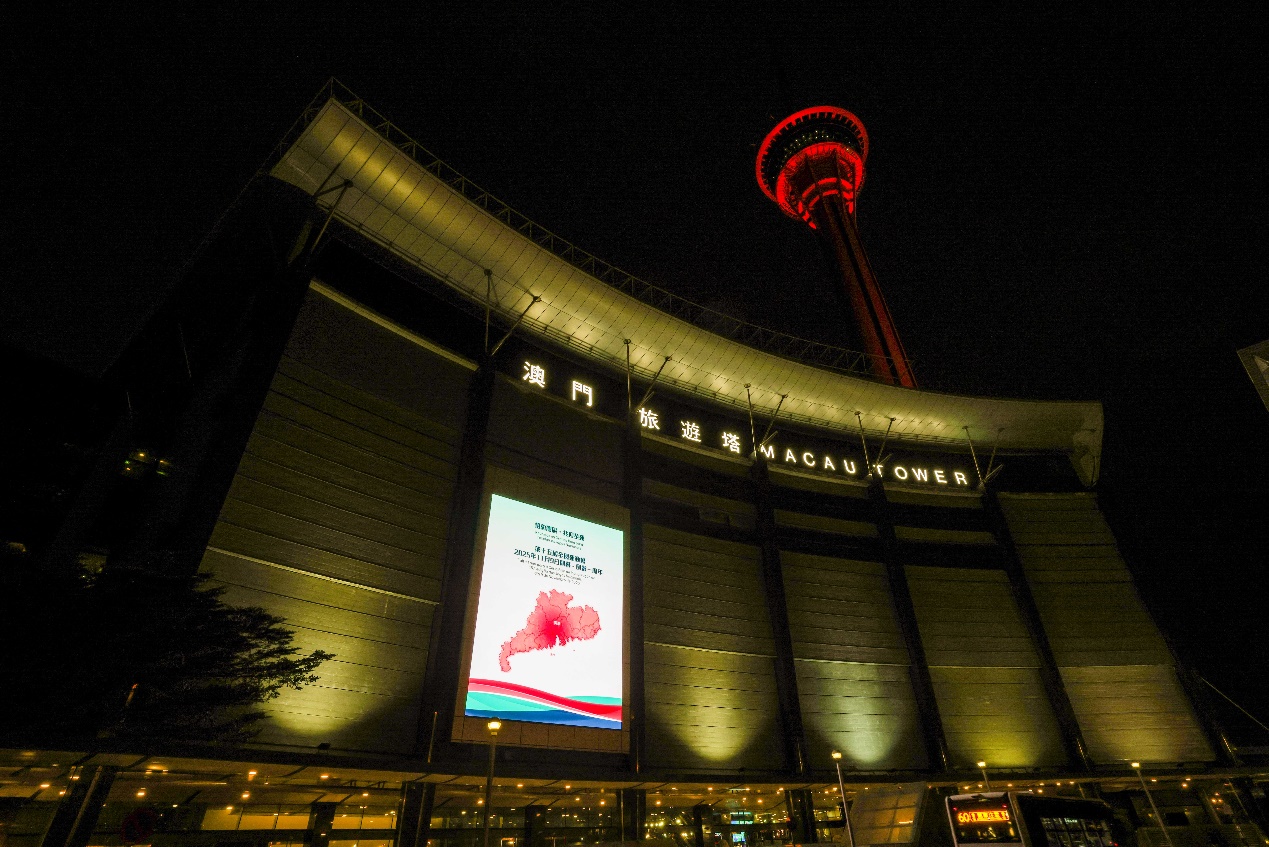 图为澳门旅游塔户外大屏幕上亮起的“相约湾区 共迎全运”标语。澳门赛区筹备办公室供图