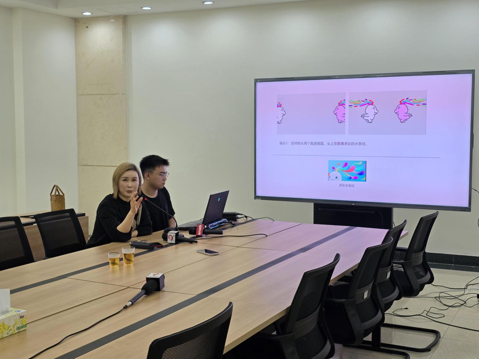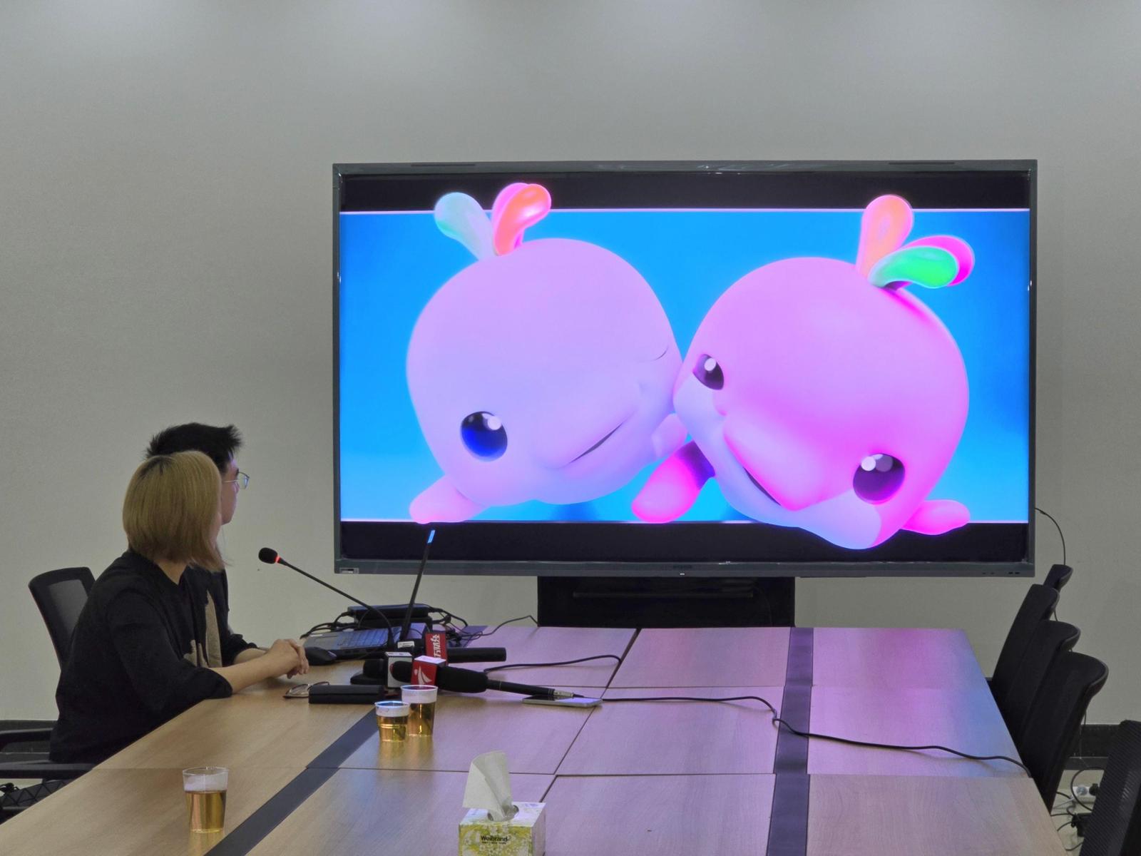 接到任务的那一天,何萌萌还沉浸在当妈妈的喜悦中,但她毅然决然接下任务:“这是我的荣誉,也是对我的一份信任。但当时的时间真的已经很紧迫了,我们马上投入到动画制作中来。”据何萌萌介绍,在动画制作的初期,他们并不清楚会徽和吉祥物的具体模样,只是了解吉祥物的原型是白海豚。何萌萌和她的团队画了一张张手稿和分镜,研究海豚跃出海面的画面及背景,最终确定了大致的制作方向。