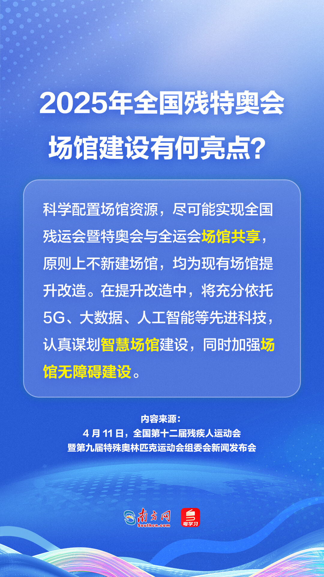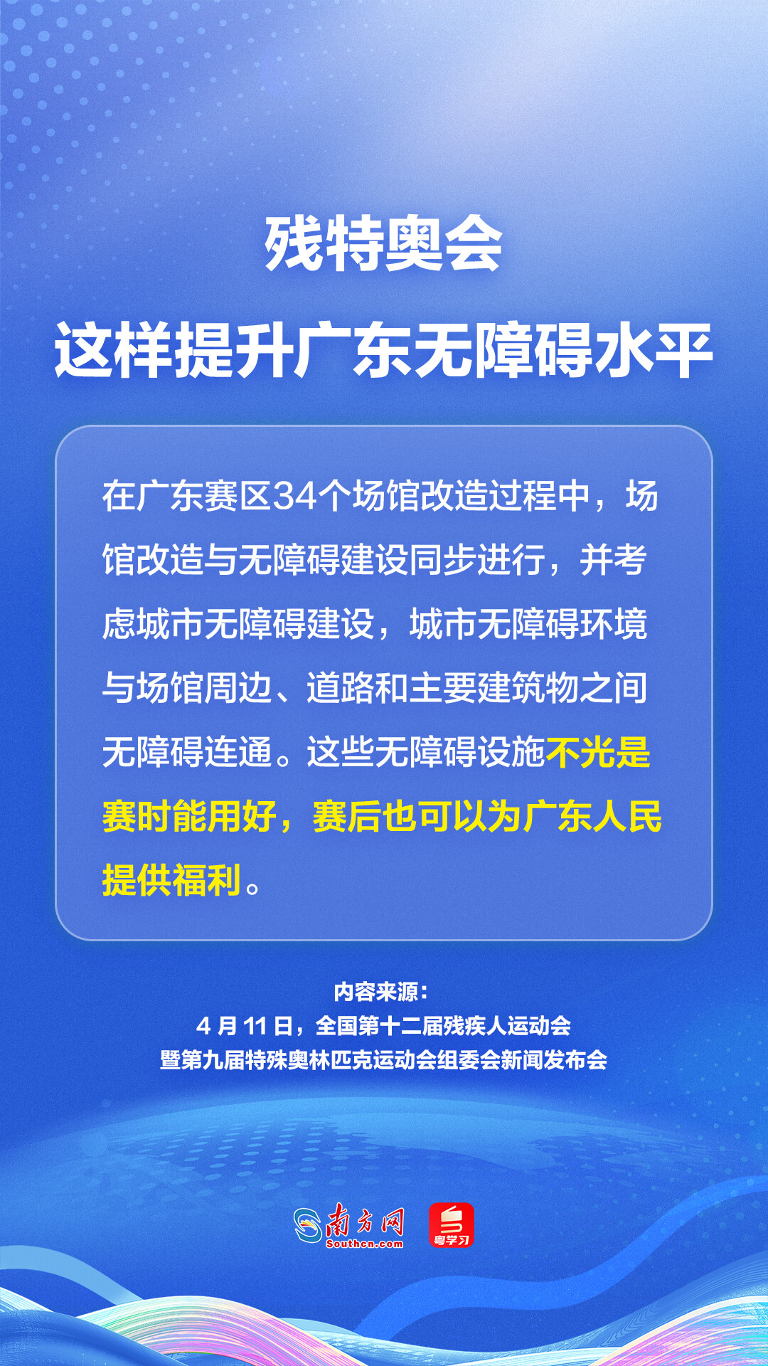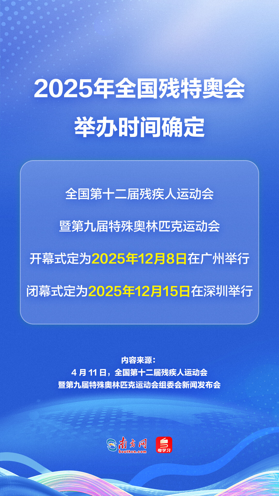 4月11日下午,全国第十二届残疾人运动会暨第九届特殊奥林匹克运动会(下称“2025年全国残特奥会”)组委会新闻发布会在广州召开,发布会上透露了2025年全国残特奥会的举办时间、赛事项目、场馆建设等重要信息。广东省如何为2025年全国残特奥会提供保障?全省无障碍环境建设情况如何?一组海报带你速览发布会要点: