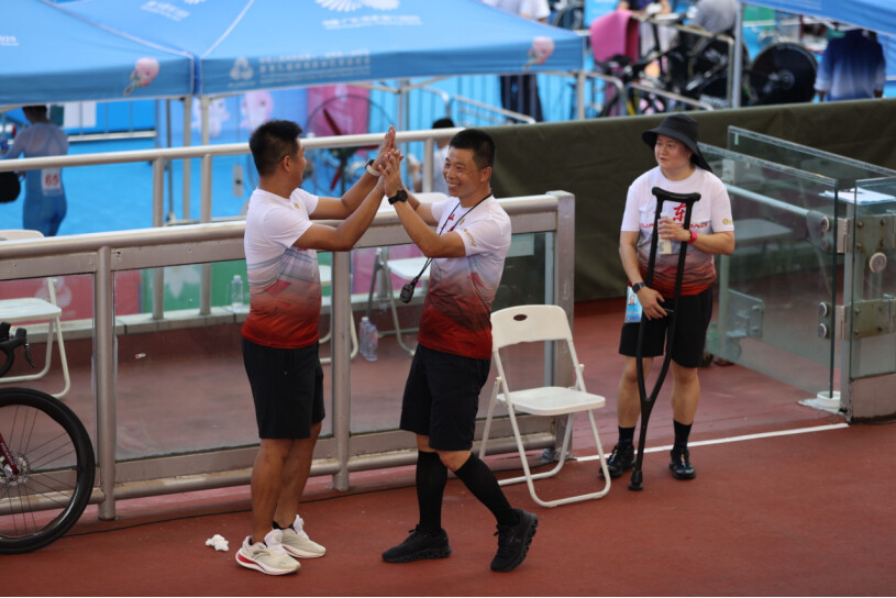 在C2级别男子3公里个人追逐赛中,41岁的中国传奇老将、残奥会中国代表团自行车队队长梁贵华,以0.82秒的微弱优势,力压山东队王永海夺冠。赛场上,两位实力悍将在主、次道展开激烈追逐,赛况十分胶着,肉眼难辨的胜负牵动着现场观众的心。几乎同时冲过终点后,两人同时降速、互相靠近,并握手致意,现场观众报以热烈的掌声。