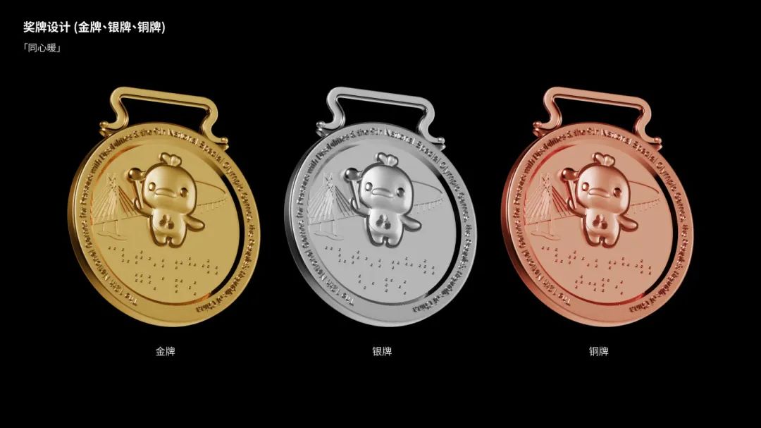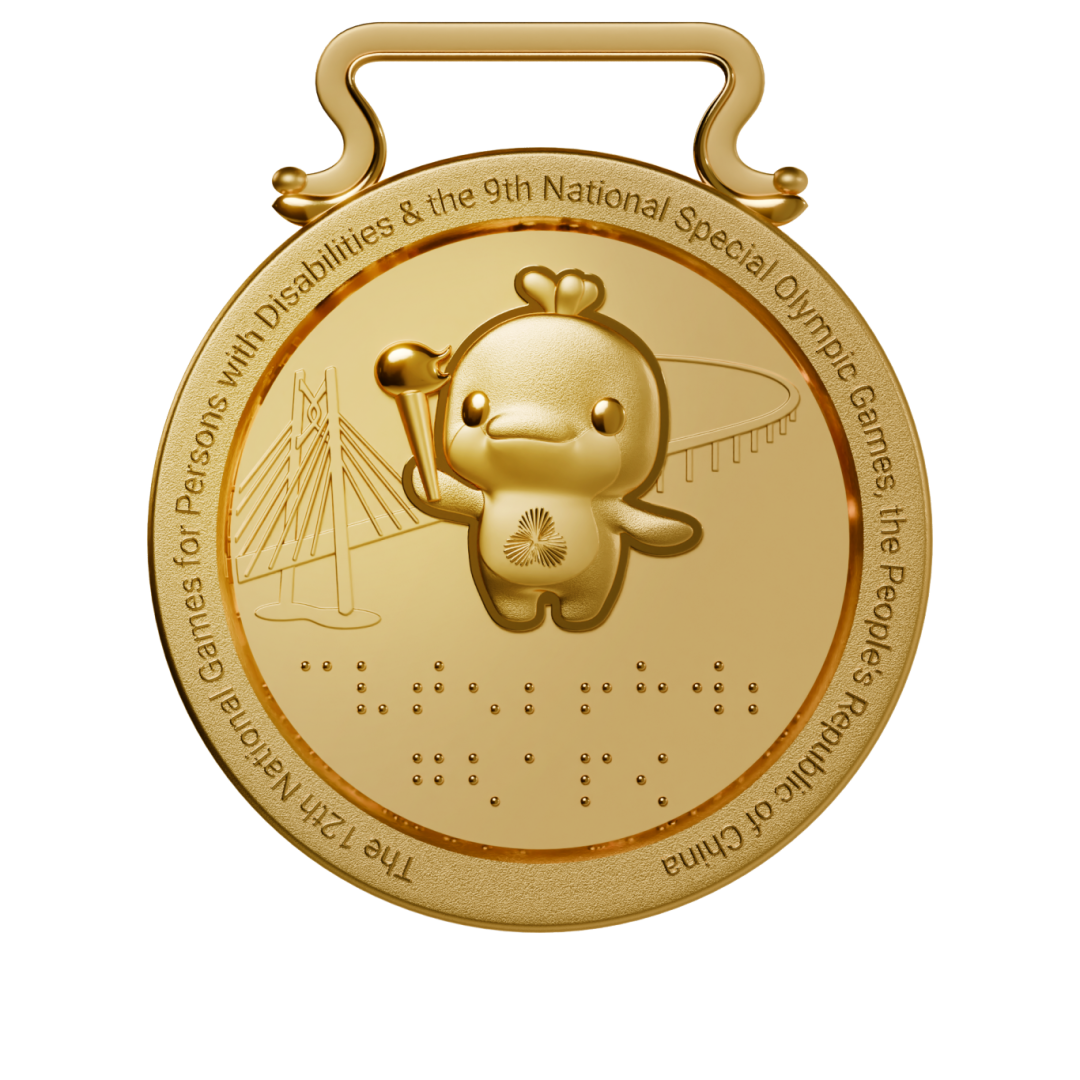 奖牌背面,中华白海豚浮雕,吉祥物高擎火炬,象征奥林匹克精神生生不息、代代相传。浮雕下方创新性地应用了盲文(第一行“残特奥会”,第二行分别为“金牌”“银牌”“铜牌”)。体现了对参赛者的用心与尊重,让视障运动员能够亲手触摸这份沉甸甸的荣耀,真切感受属于他们的荣光。背景上的港珠澳大桥是圆梦桥、同心桥、自信桥、复兴桥,体现了逢山开路、遇水架桥的奋斗精神,体现了我国综合国力与自主创新能力,体现了勇创世界一流的民族志气,传递着同心携手、融合发展的图景。