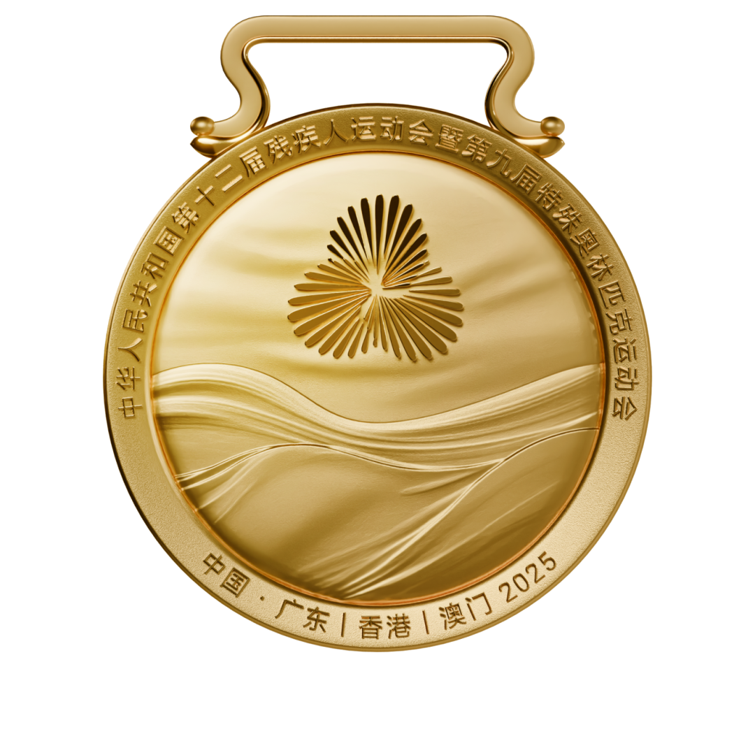 奖牌正面,精心镌刻的连绵海浪纹,象征着大海的广阔与包容,传递着残特奥会汇聚万众一心、众志成城的力量,更代表着运动员们破浪前行、永不言弃的意志与激情。奖牌设计融合传统与现代,一边是承载历史的岭南镬耳屋,一边是象征活力湾区的澎湃海浪,如同港珠澳大桥与岭南建筑跨越时空对话。