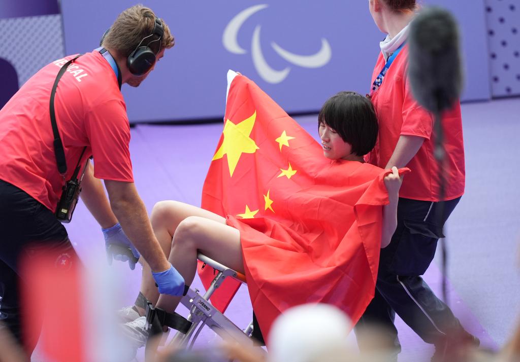 史逸婷在女子200米T36级决赛中拼到双腿力竭,打破残奥会纪录夺冠。被搀上椅子后,她努力张开五星红旗向全场展示。