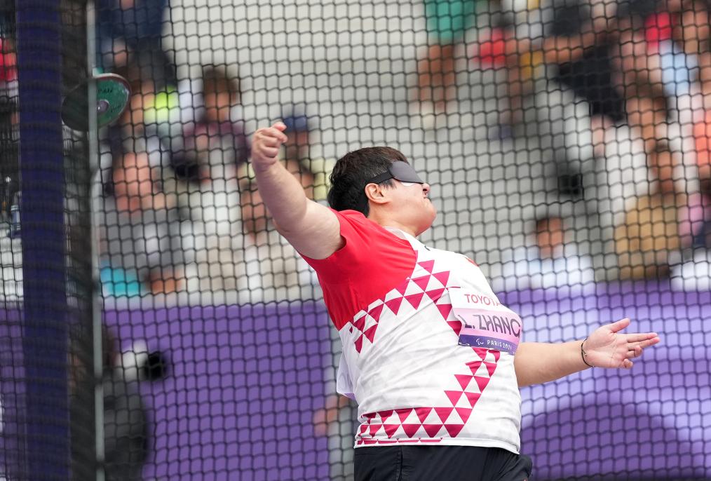 9月3日,张亮敏在比赛中试投。当日,在巴黎残奥会田径女子铁饼F11级决赛中,中国选手张亮敏以39米08的成绩获得金牌。新华社记者 贺灿铃 摄