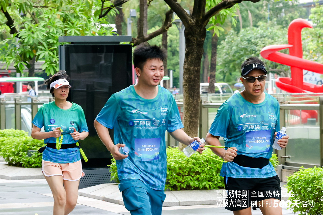 为积极宣传残特奥会倒计时500天,7月26日上午8点,60名跑者俩俩“牵手”,从广州市花城广场出发,迎着朝阳开始在珠江边上晨练。