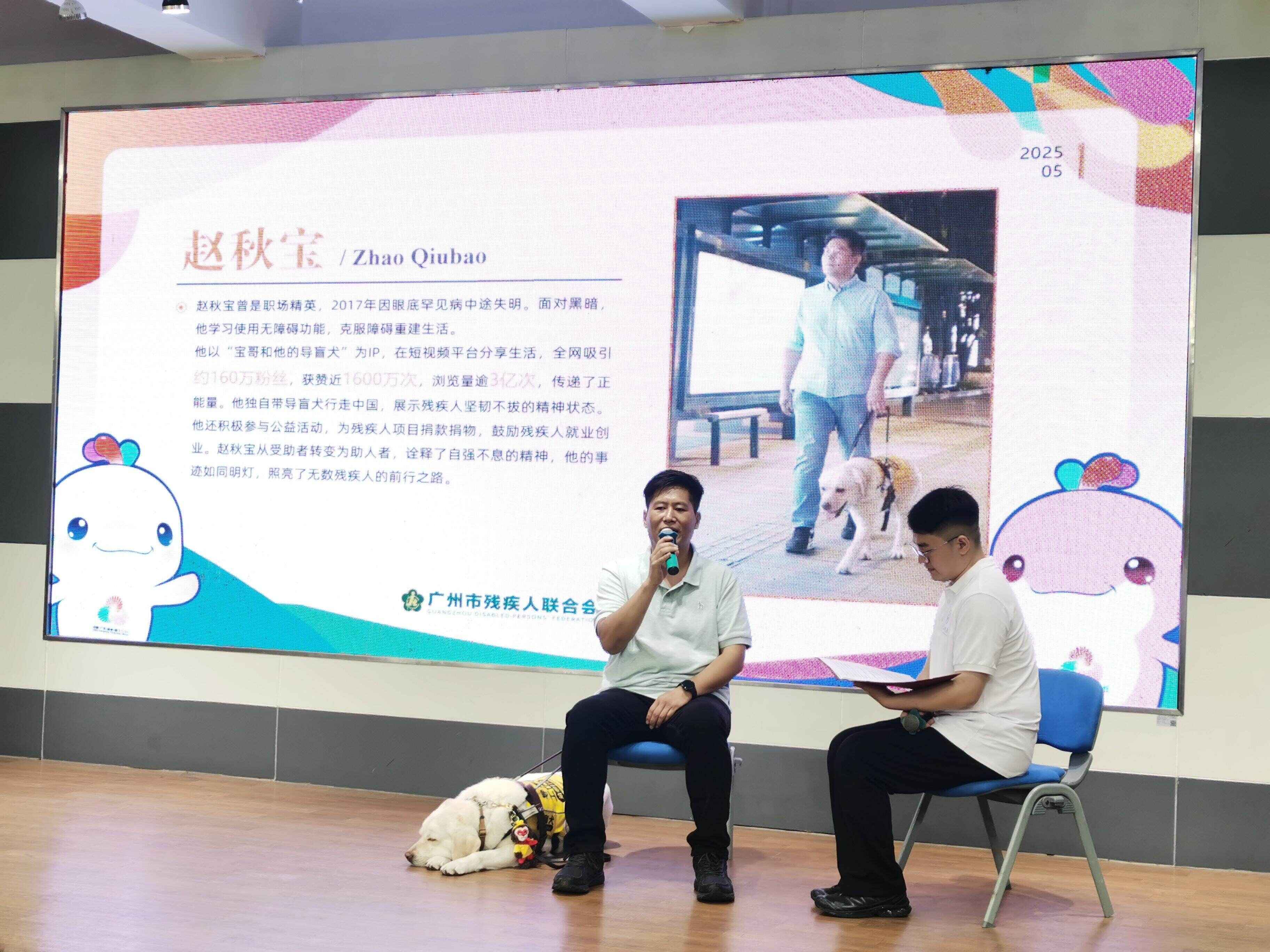 视障人士赵秋宝的分享同样打动人心。曾是职场精英的他,2017年因眼底罕见病失明,但他没有被黑暗打倒,而是学习使用无障碍设备,重建生活。他以 “宝哥和他的导盲犬” 为IP在短视频平台分享生活,全网吸引约160万粉丝,获赞近1600万次,浏览量逾3亿次。他独自带导盲犬行走中国,传递正能量。在分享中,他讲述了传递残特奥会画卷行走中国的意义,分享了在中国各个城市出行时感受到的陌生人的善意,还鼓励大学生们要勇敢探索校园生活,积极面对困难。