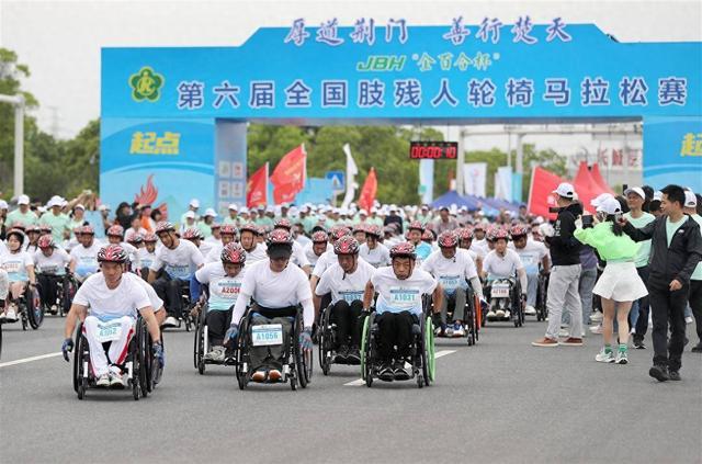 5月10日,第六届全国肢残人轮椅马拉松赛在湖北省荆门市举行。来自全国42支代表队的352名轮椅马拉松运动员,在全长6公里的赛道上展示坚韧不拔的风采。