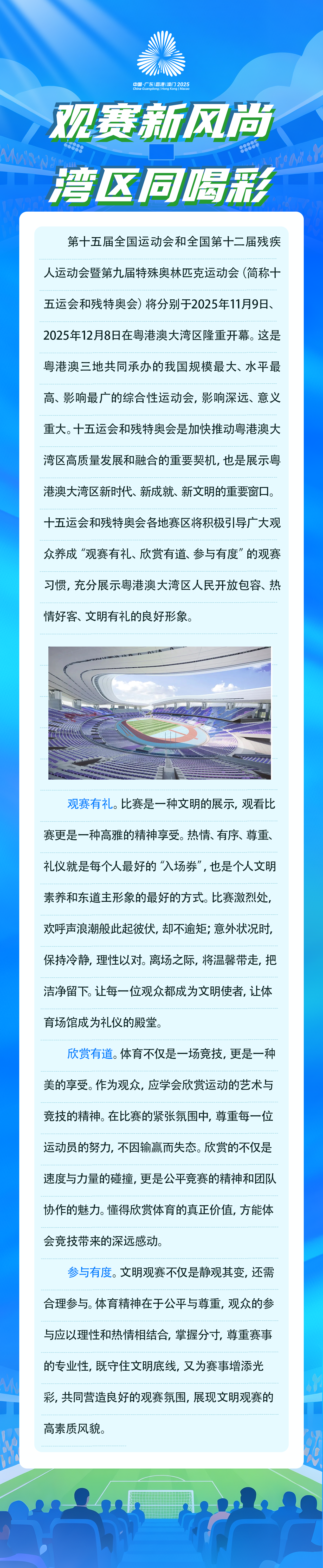 第十五届全国运动会和全国第十二届残疾人运动会暨第九届特殊奥林匹克运动会(简称十五运会和残特奥会)将分别于2025年11月9日、2025年12月8日在粤港澳大湾区隆重开幕。这是粤港澳三地共同承办的我国规模最大、水平最高、影响最广的综合性运动会,影响深远、意义重大。十五运会和残特奥会是加快推动粤港澳大湾区高质量发展和融合的重要契机,也是展示粤港澳大湾区新时代、新成就、新文明的重要窗口。十五运会和残特奥会各地赛区将积极引导广大观众养成“观赛有礼、欣赏有道、参与有度”的观赛习惯,充分展示粤港澳大湾区人民开放包容、热情好客、文明有礼的良好形象。