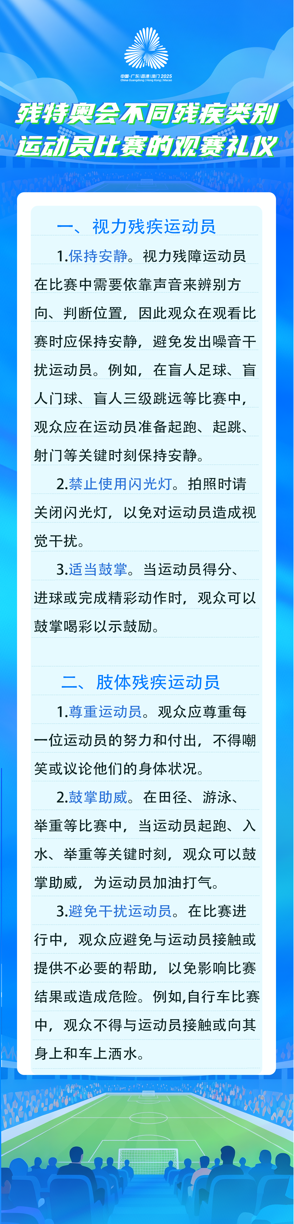 1.保持安静。视力残障运动员在比赛中需要依靠声音来辨别方向、判断位置,因此观众在观看比赛时应保持安静,避免发出噪音干扰运动员。例如,在盲人足球、盲人门球、盲人三级跳远等比赛中,观众应在运动员准备起跑、起跳、射门等关键时刻保持安静。