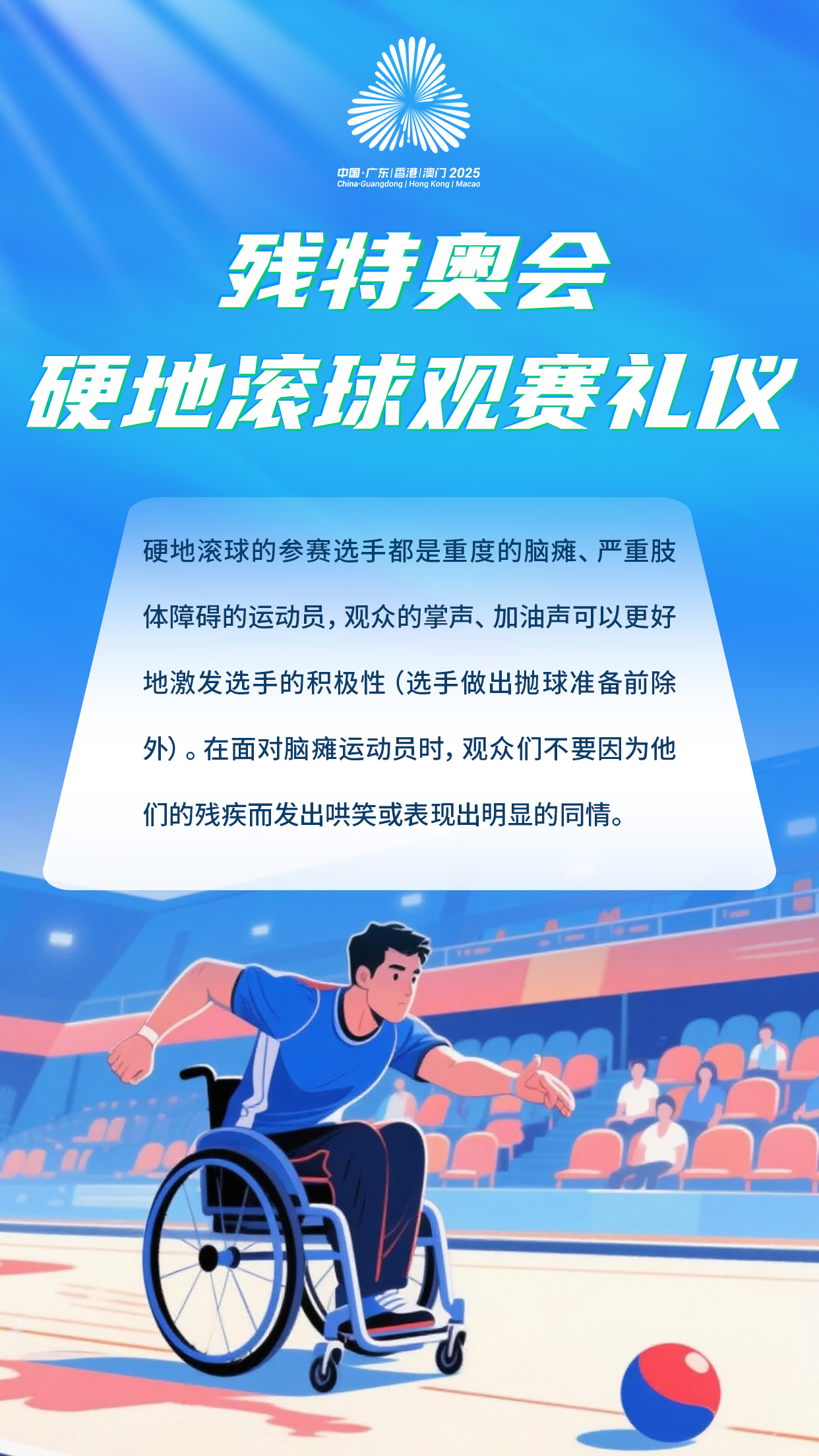 观赛礼仪:硬地滚球的参赛选手都是重度的脑瘫、严重肢体障碍的运动员,观众的掌声、加油声可以更好地激发选手的积极性(选手做出抛球准备前除外)。在面对脑瘫运动员时,观众们不要因为他们的残疾而发出哄笑或表现出明显的同情。