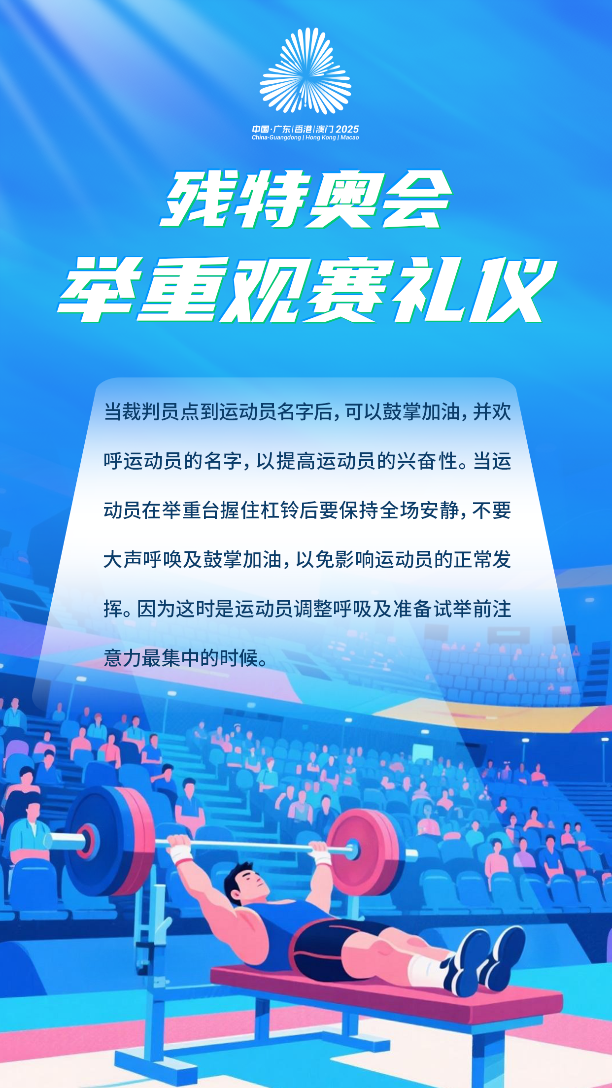 观赛礼仪:比赛期间,观众应尽量减少在场馆内走动,自觉将手机处于关机、静音或振动状态。当残疾人运动员在赛场上尽力比拼的时候,他们的每一个动作、每一次成功,都是激励和鼓舞人们的动力,应该用热情的掌声激励运动员。