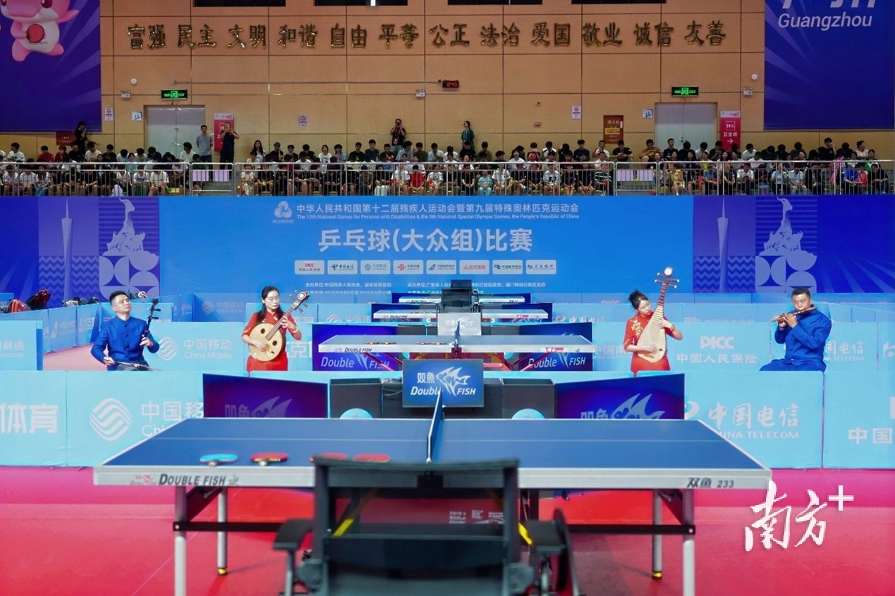 开赛仪式上,文体展演环节创新融合体育与艺术元素,为赛事注入艺术活力。表演邀请广东音乐曲艺团演奏者,与广东省残疾人艺术团琵琶演奏者共同演绎重新编创的经典乐曲《步步高》,将传统岭南音韵与乒乓球击球节奏完美融合,明快昂扬的旋律展现了残疾人运动员奋发向上的精神风貌,也寄托了运动员“勇攀高峰”的美好祝愿。