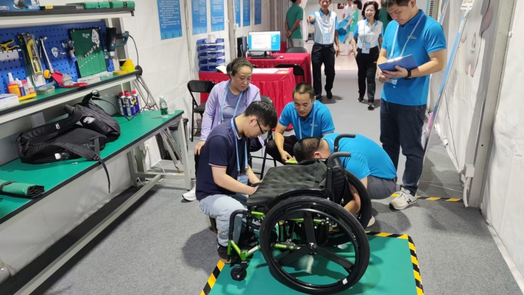 此外,本次赛事还特意加入了康复辅具保障服务站,科学划分了接待、维修、评估、存储等功能区域,为运动员和技术官员提供一站式辅具维修和借用服务。这也是广州赛区率先提出的残特奥会辅具保障服务模式,创新构建了“1+5+10+N”残特奥会辅具保障服务网络体系,即以1个保障服务中心为枢纽,5个竞赛场馆保障服务站为支点,10个接待酒店爱心服务专柜为延伸,配合流动服务车实现全域机动支援。