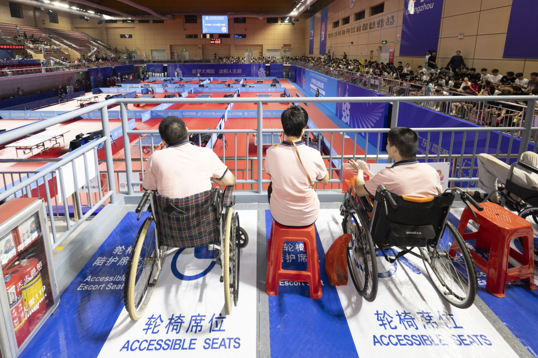 在场馆内,部分球台经过特殊调整,使高度更适合轮椅运动员;球台的固定脚做了加深处理,方便轮椅进入;进场位置场地空间进行了扩大,方便轮椅回转;志愿者队伍经过严格培训,提供恰到好处的协助,却又不过度干预,最大限度保障了运动员的独立与尊严。