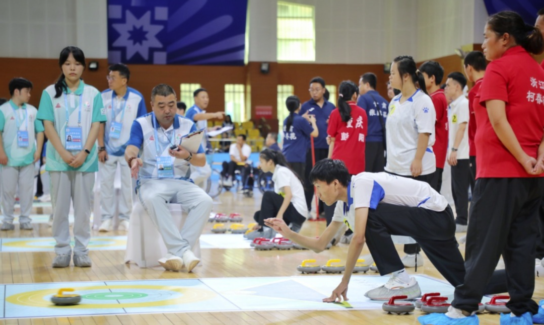 甘肃代表队教练员赵东晖同样感受到旱地冰壶推广的势头,“因为不限年龄,玩起来安全又方便,行动不便的残疾人和健全人都能参与,这项运动在我们当地普及度非常高,连公司团建都能玩。”