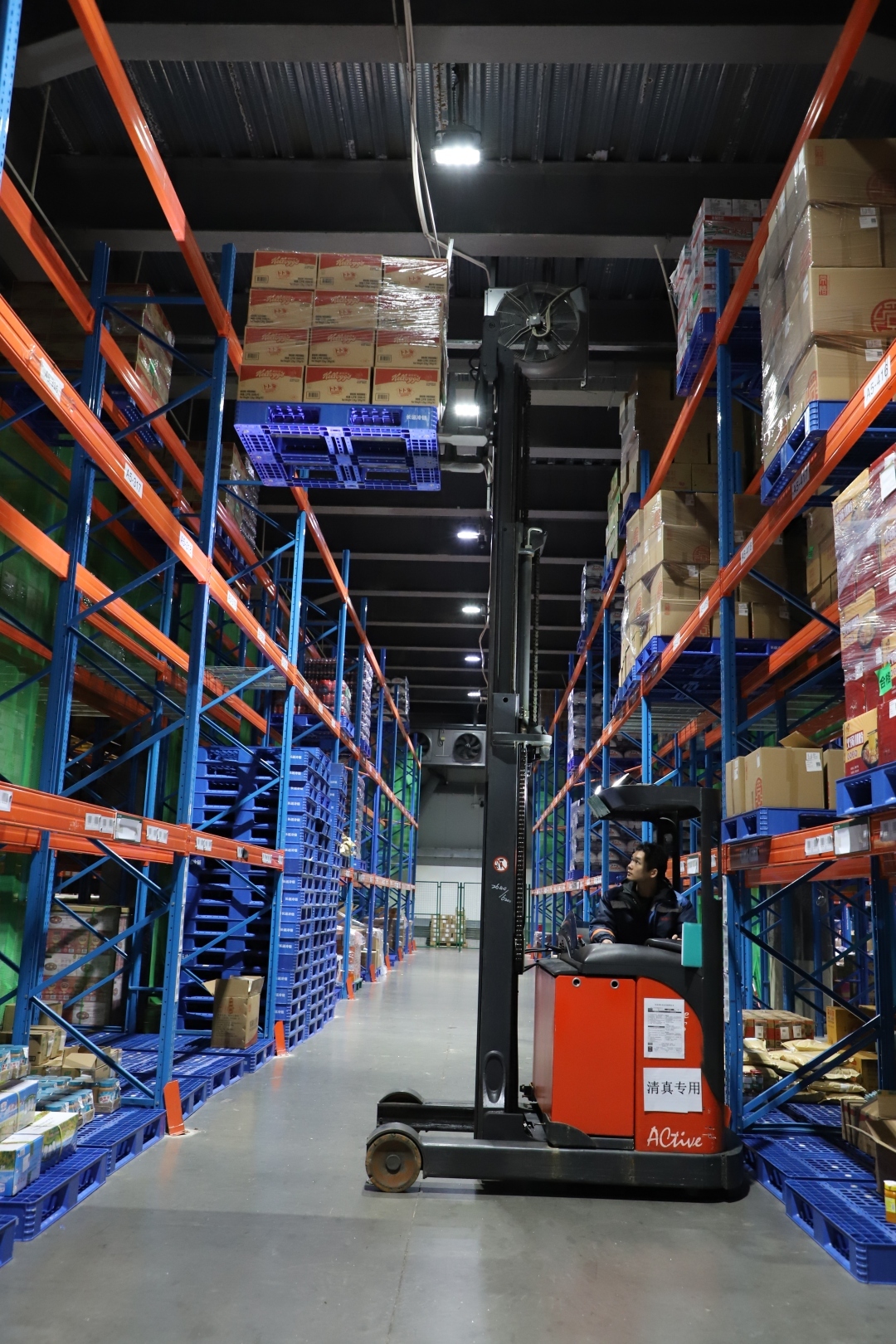 位于广州天河区的总仓,其5000平方米的空间被精准划分为不同温区:冷冻仓恒定在-18℃,最受欢迎的虾饺就是存储于此,以及肉类和定制包点等;冷藏仓细分为三个子温区,主要用来存放蔬菜和水果,常温区则严格控制在15到25摄氏度之间,主要存放米面粮油等长保食品。记者在现场看到,临近赛事尾声,仓库内的食材库存不多,保持在匹配的需求量上。