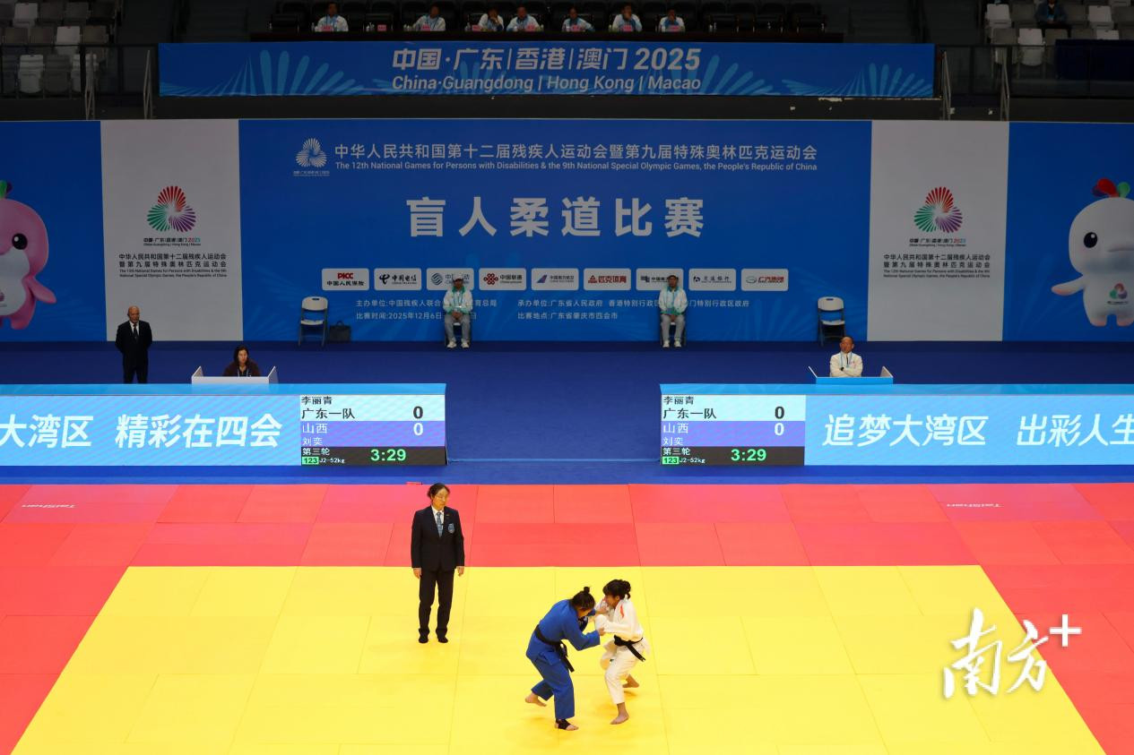 一记关节锁技、一次“一本”瞬击……在全国第十二届残疾人运动会暨第九届特殊奥林匹克运动会盲人柔道比赛女子J2-52公斤级比赛中,广东选手李丽青用两场酣畅淋漓的胜利锁定冠军,为东道主赢下本届柔道赛事的首枚金牌。