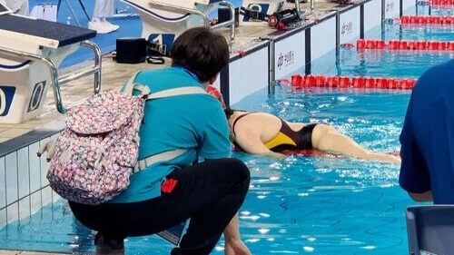 12月9日,在江门体育中心游泳馆男子8–11岁组200米蛙泳比赛中,海南队8岁特奥小将张艾泽轩因……>>