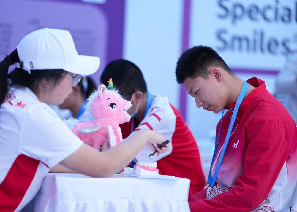 12月8日,在广东省中山市体育馆(副馆),工作人员为特奥运动员普及护齿知识。新华社记者 杨晨光 摄