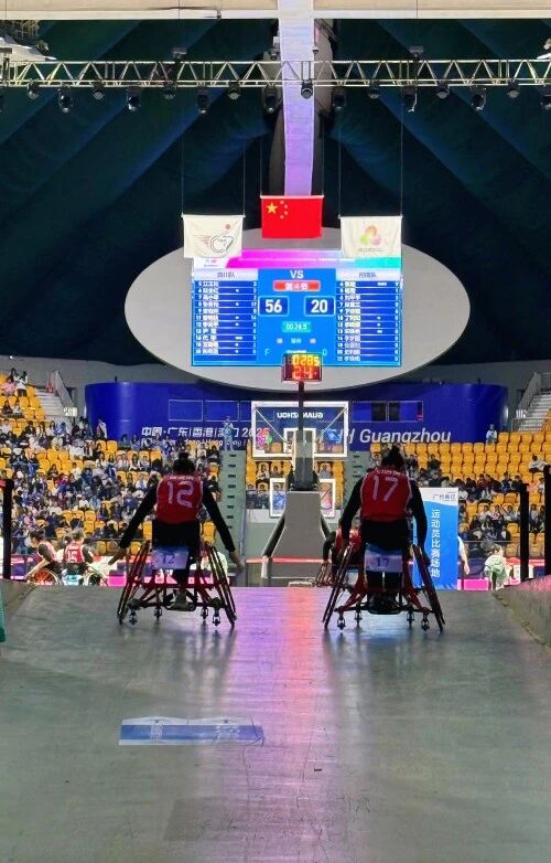 轮椅篮球运动员稍作休整后,自行驱动轮椅,驶向赛场