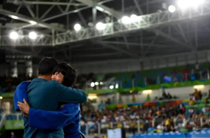 李丽青(右)在里约残奥会柔道女子48公斤级决赛中夺冠后,与教练张贵富拥抱。
