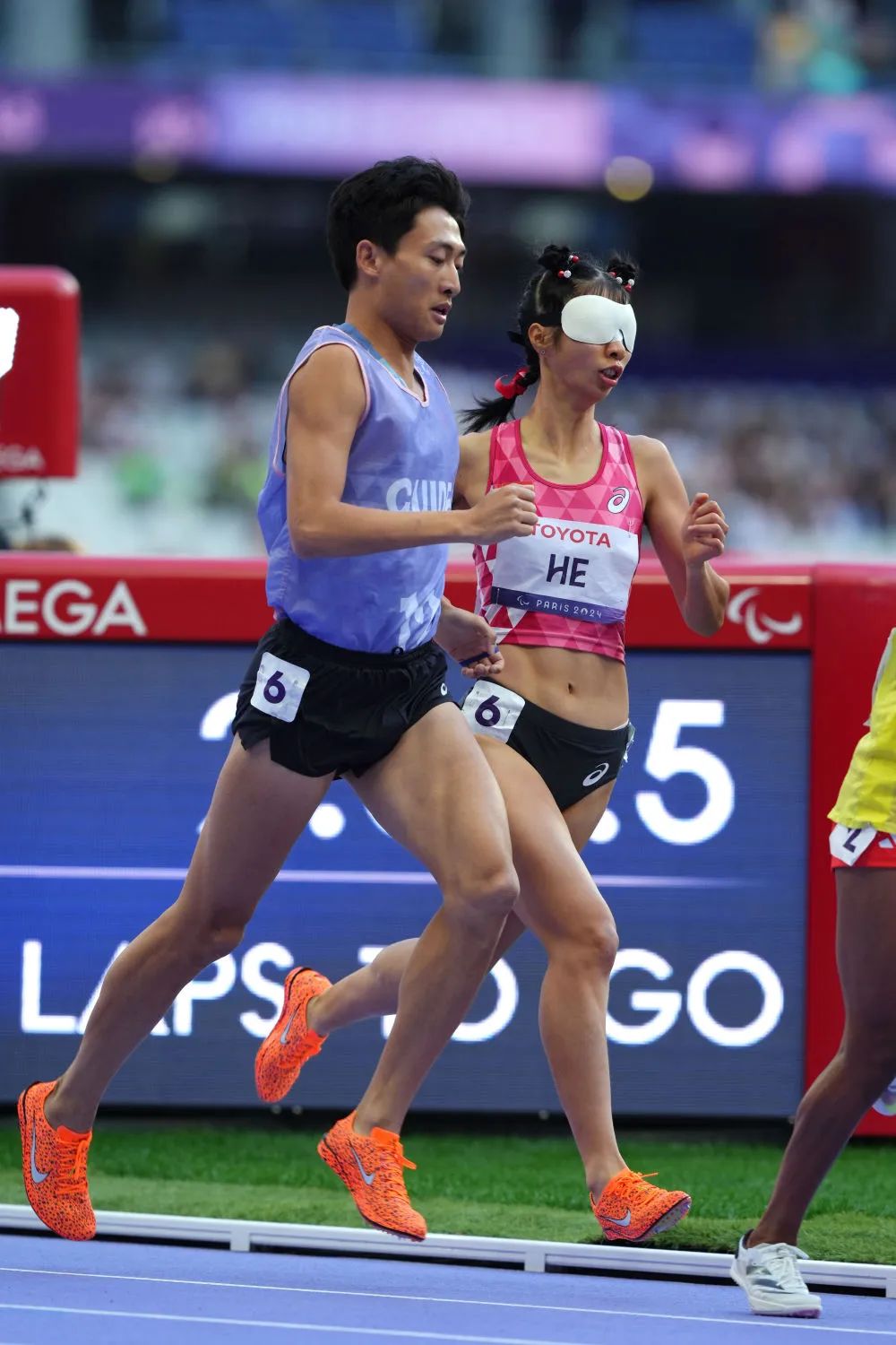 9月2日,中国选手何珊珊(右)与领跑员游俊杰在比赛中。新华社记者 才扬 摄
