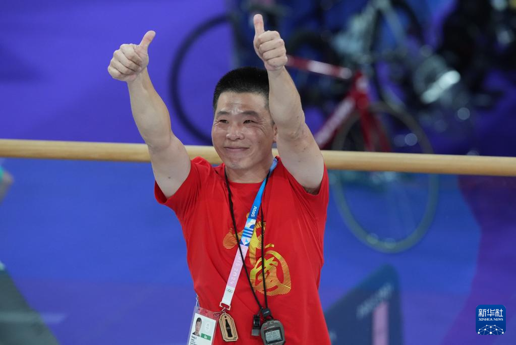 8月29日,场地自行车教练员李鹏庆祝王小梅夺冠。