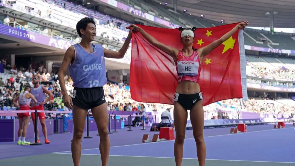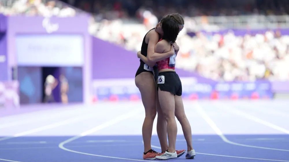 冲过巴黎残奥会女子1500米T11级决赛的终点线,梳着可爱丸子头的何珊珊和她的引跑员游俊杰紧紧拥……>>