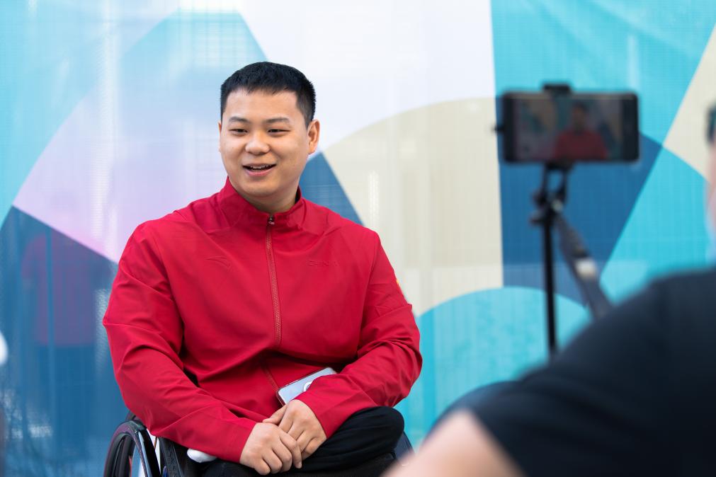 8月27日,中国男子举重运动员齐勇凯在法国巴黎接受采访。新华社记者 张豪夫 摄