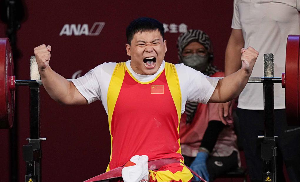 在东京残奥会举重项目男子59公斤级决赛中,齐勇凯获得金牌。新华社记者 熊琦 摄