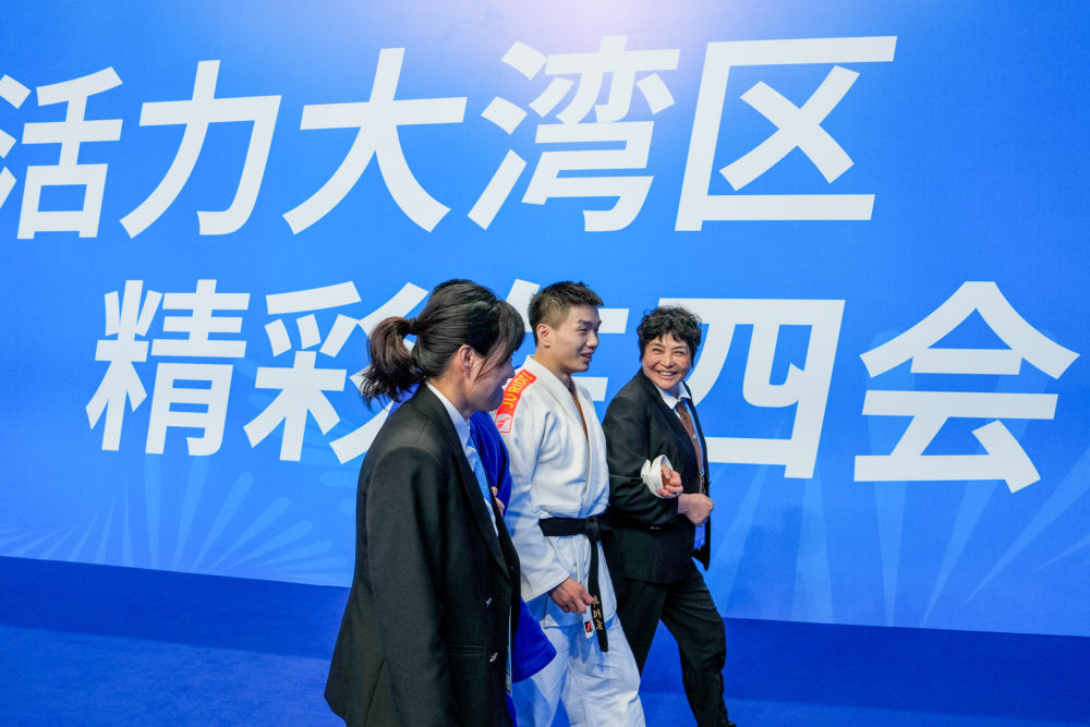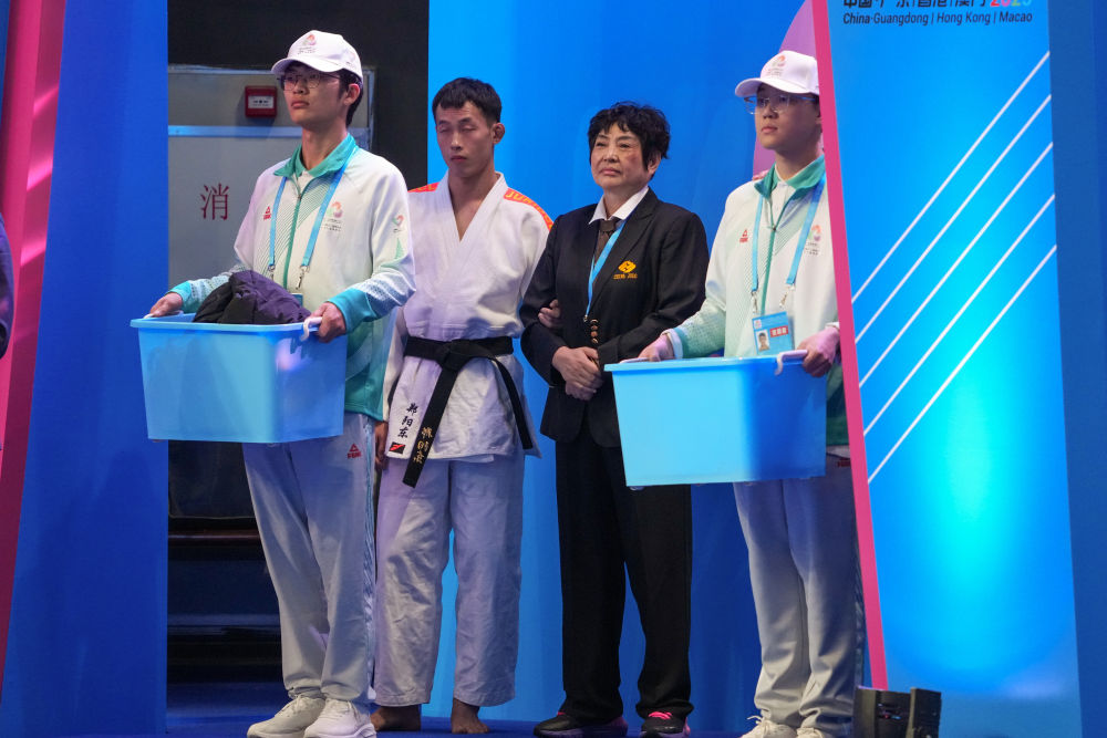 ↑12月9日,李跃华(右一)赛后引导队员朱世文(中)退场。朱世文获得全国残特奥会盲人柔道男子J1-70公斤级金牌。新华社记者 张楠 摄