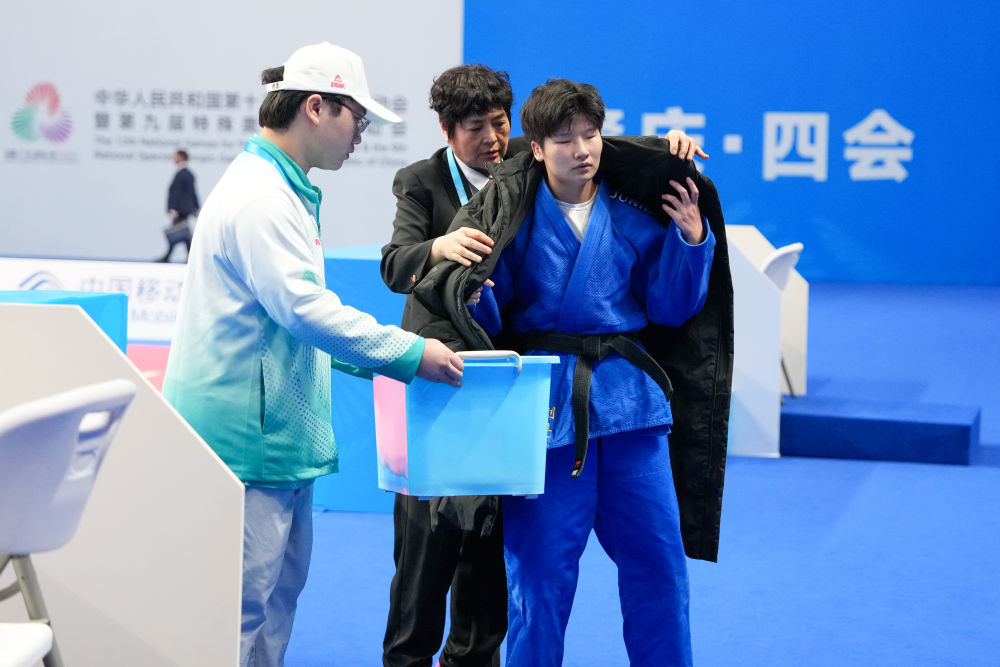 ↑12月11日,李跃华(中)在赛后为队员刘立披上外衣。刘立获得全国残特奥会盲人柔道女子J1-70公斤级比赛金牌。新华社记者 张楠 摄
