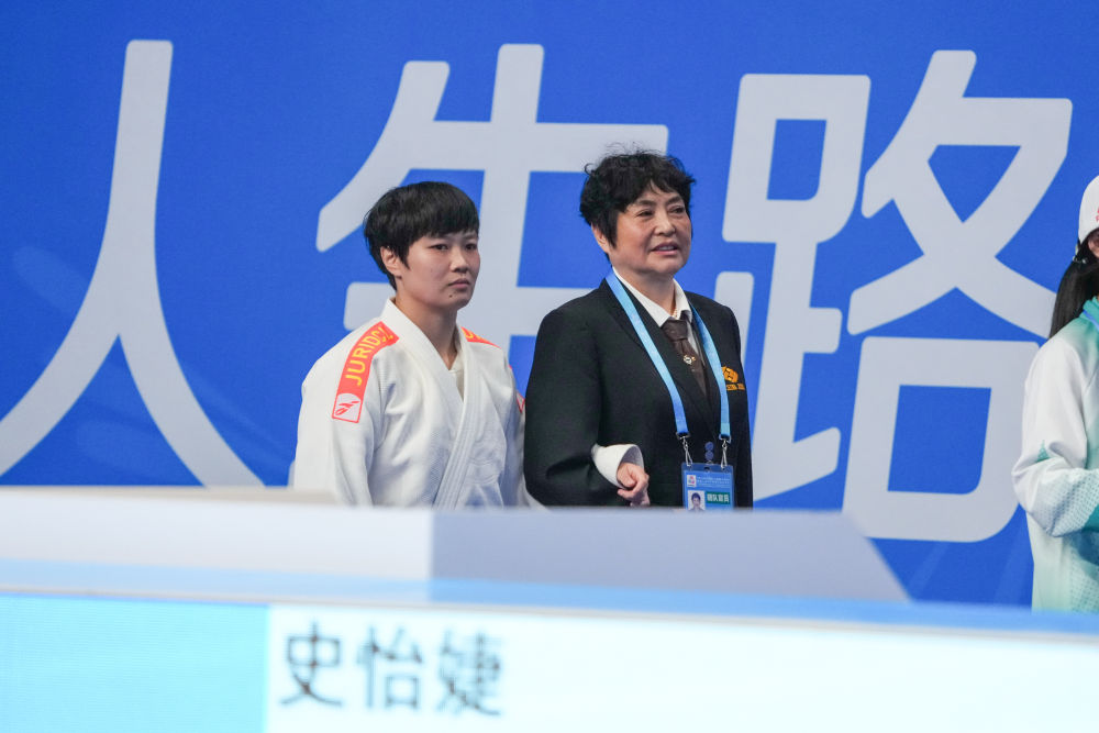 ↑12月10日,李跃华(右)在赛后引导队员史怡婕退场。史怡婕获得全国残特奥会盲人柔道女子J1-60公斤级比赛金牌。新华社记者 张楠 摄