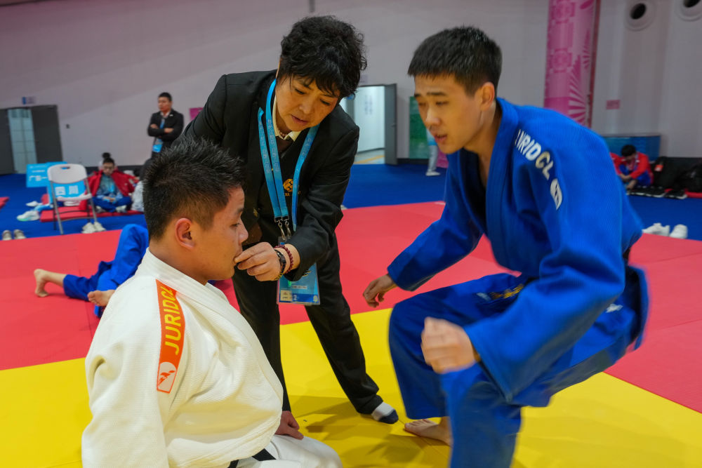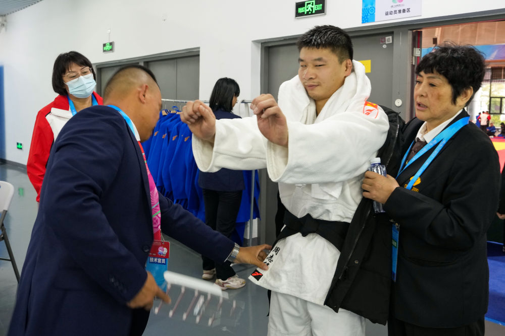 ↑12月10日,李跃华(右一)带领队员周志伟(右二)进行赛前检查。周志伟获得全国残特奥会盲人柔道男子J1-81公斤级比赛金牌。新华社记者 张楠 摄