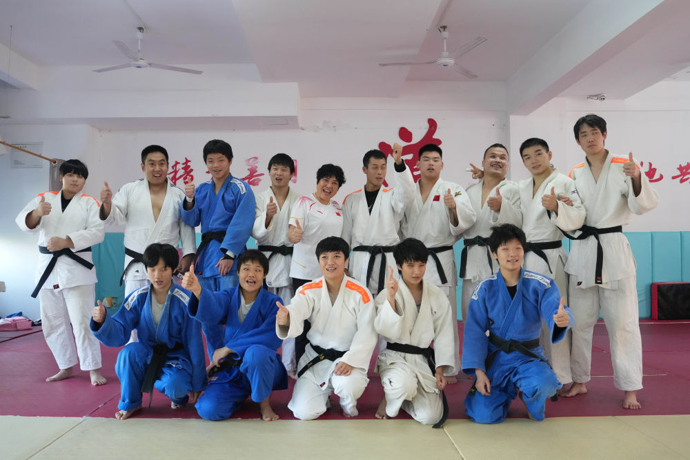 ↑10月9日,李跃华和她指导的盲人柔道队在长沙市超辉残疾人体育训练培训中心合影。新华社记者 薛宇舸 摄