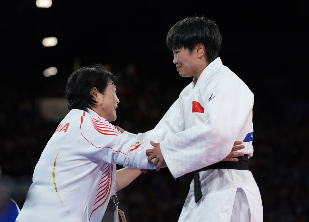 ↑2024年9月5日,在巴黎残奥会盲人柔道女子57公斤J1级决赛中,史怡婕11比0战胜美国选手穆提娅,获得金牌。史怡婕(右)在比赛后和教练李跃华庆祝胜利。新华社记者 邢广利 摄