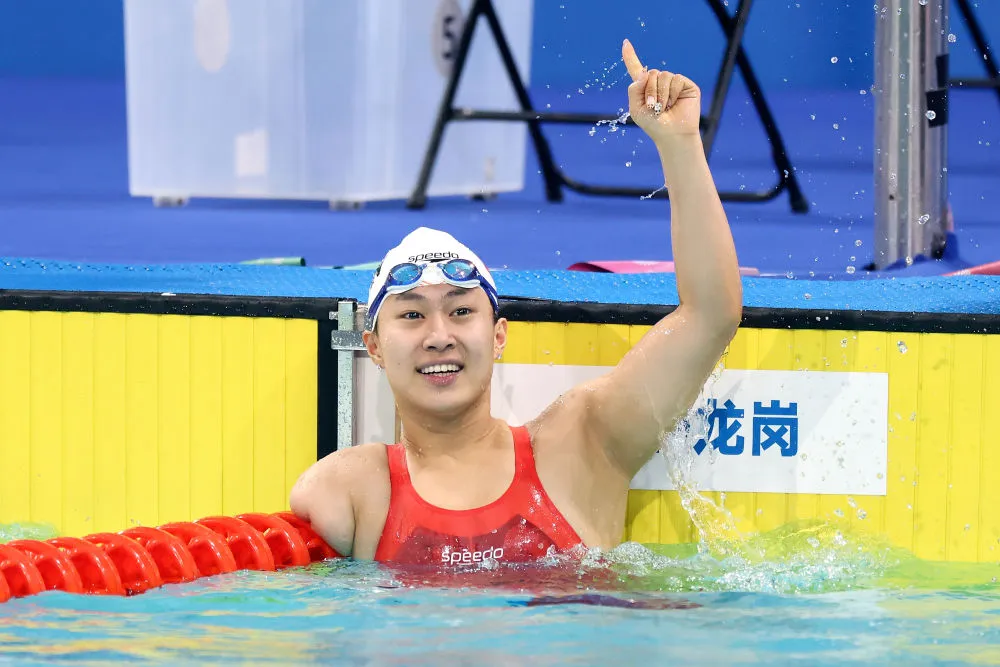 12月10日,残特奥会游泳项目在广东省深圳市举行。图为浙江队选手蒋裕燕在女子50米自由泳S6级决赛后庆祝夺冠。新华社记者 梁旭 摄