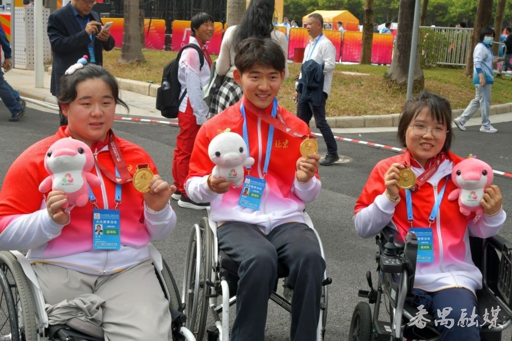 上午10时,肢体残疾坐姿组混合接力:3×2分钟计时正式开始,北京队、宁夏队、湖北队争夺团体金牌与银牌。经过激烈的比拼,最终,北京队以4米的优势险胜宁夏队。作为北京队的第一棒,高志原直言“压力山大”。原来,11月30日结束的肢体残疾坐姿组男子个人计时3分钟比赛,他遗憾未能冲金,他哽咽道,“我昨天得了银牌,今天我又是第一棒,我真的好担心,毕竟这是我这届运动会的最后一场比赛。”但最后北京队得到了金牌,他表示是团队的努力让他在这届赛事画上了完美的句号。从银牌到金牌,内心的遗憾与不放弃的信念让高志原站上了冠军领奖台,也成为他不断前行的动力。