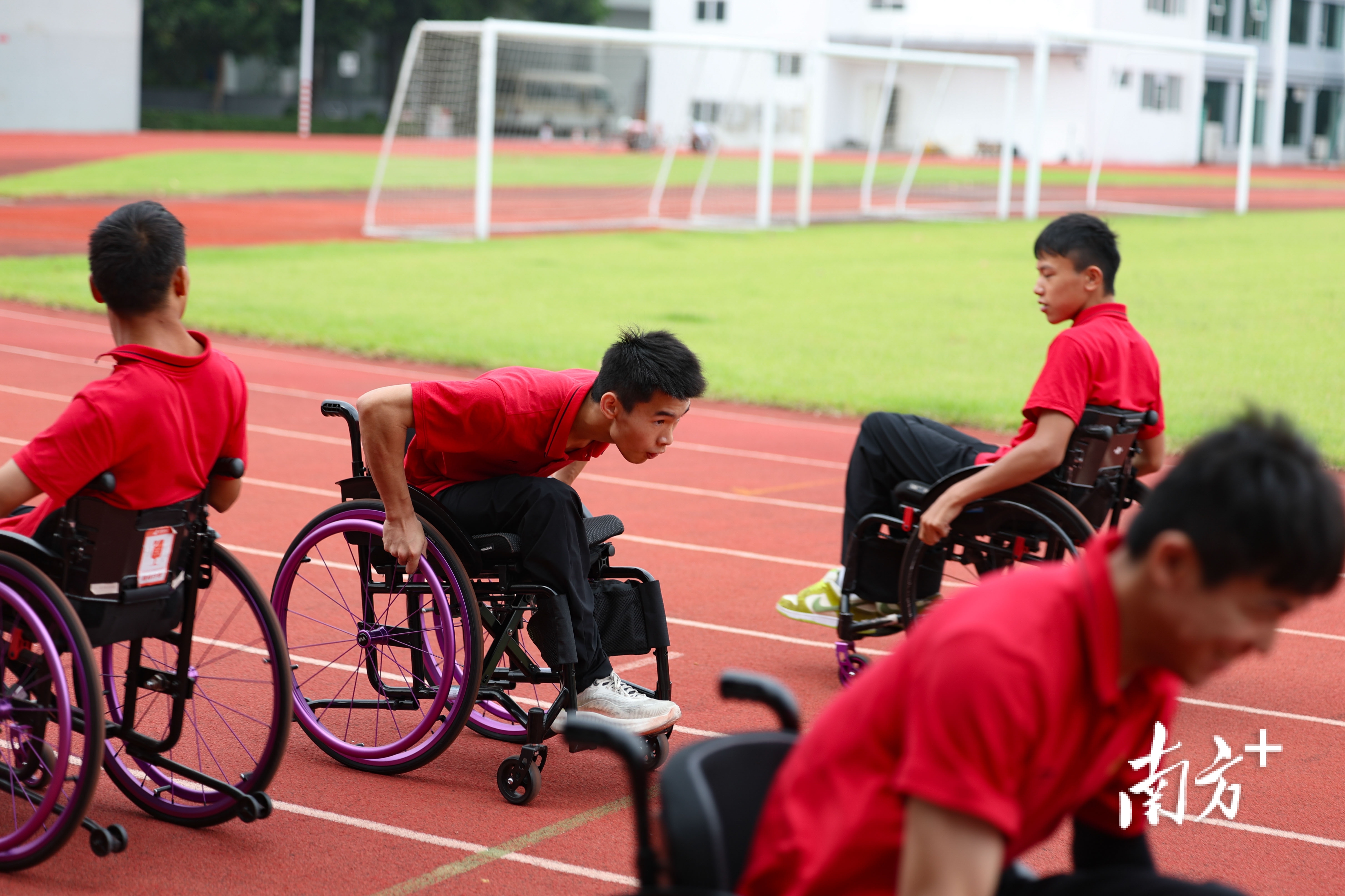日常训练中,轮椅击剑队员们在体育场上以折返跑的方式锻炼体能。