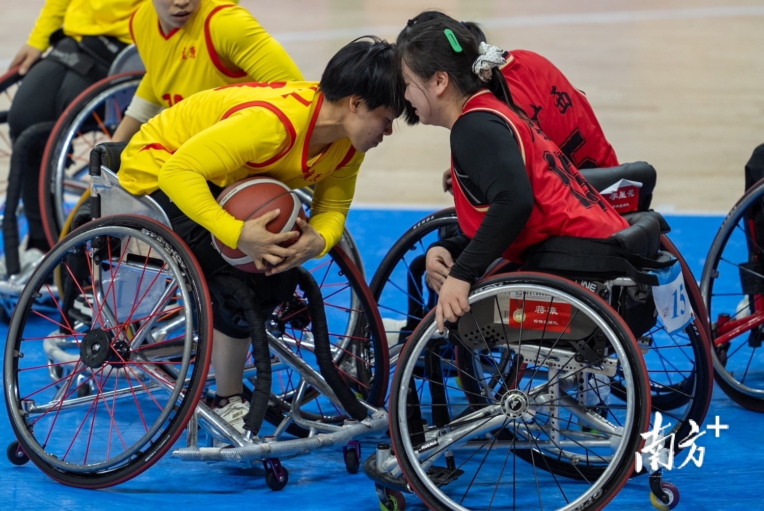 2025年12月11日,轮椅篮球女子A组小组赛广东一团与广西队球员在争抢球权。姚志豪 摄