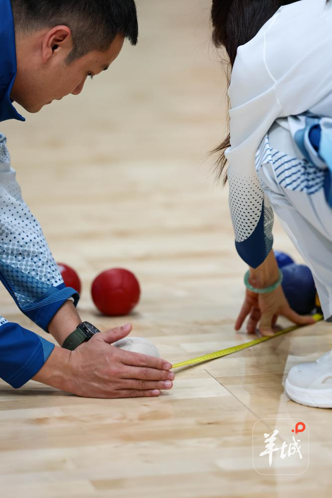 裁判员在比赛中测量球距,确认得分情况。羊城晚报记者 蔡嘉鸿 摄