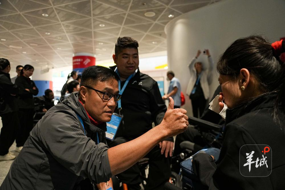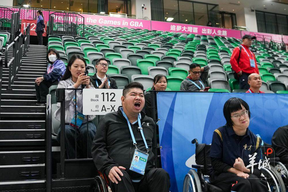 女子个人BC2-1/4决赛中,广东队选手广越楚的丈夫郑远森为妻子加油。羊城晚报记者 蔡嘉鸿 摄
