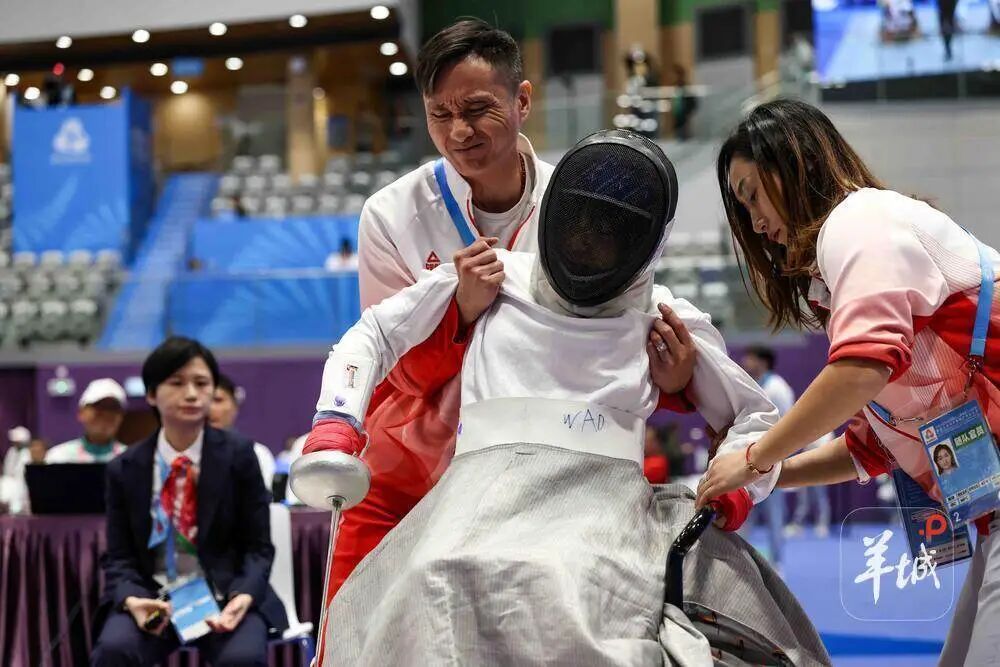 残特奥会轮椅击剑项目比赛,教练龙杰扶起刚比赛结束的运动员 资料图/羊城晚报记者 蔡嘉鸿 摄