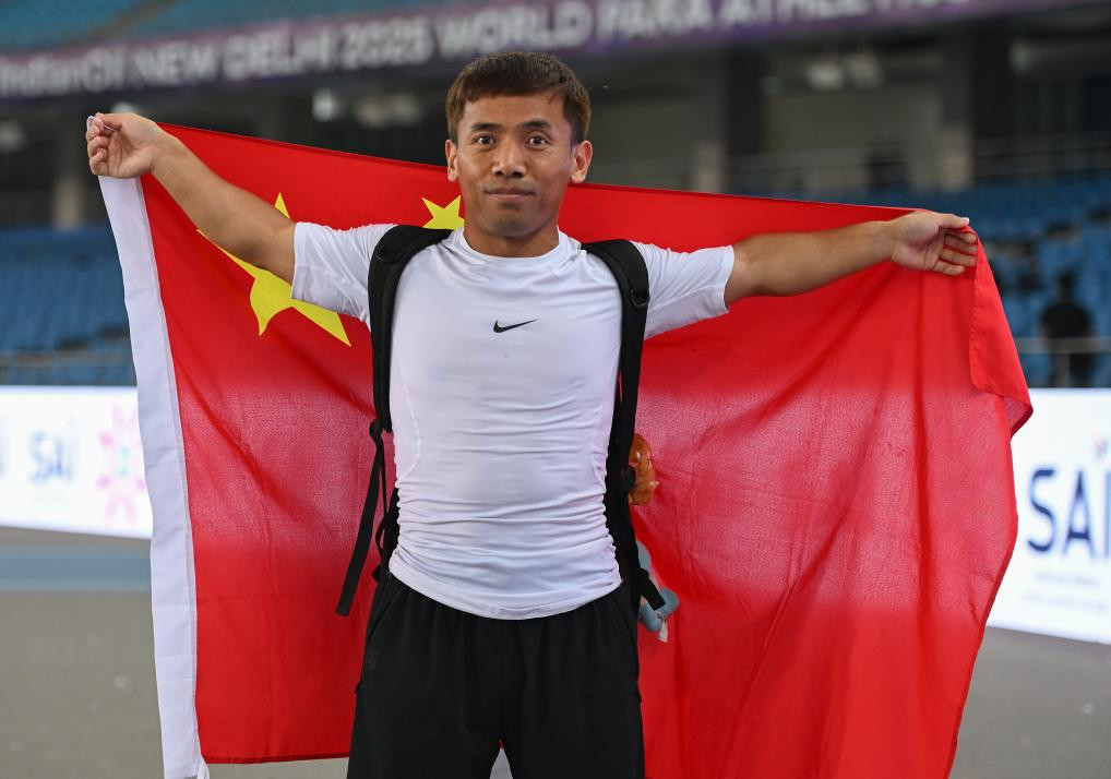 10月5日,世界残疾人田径锦标赛在印度新德里举行。图为季军中国选手孙鹏祥在男子标枪F41级决赛后庆祝。新华社发(贾韦德·达尔摄)