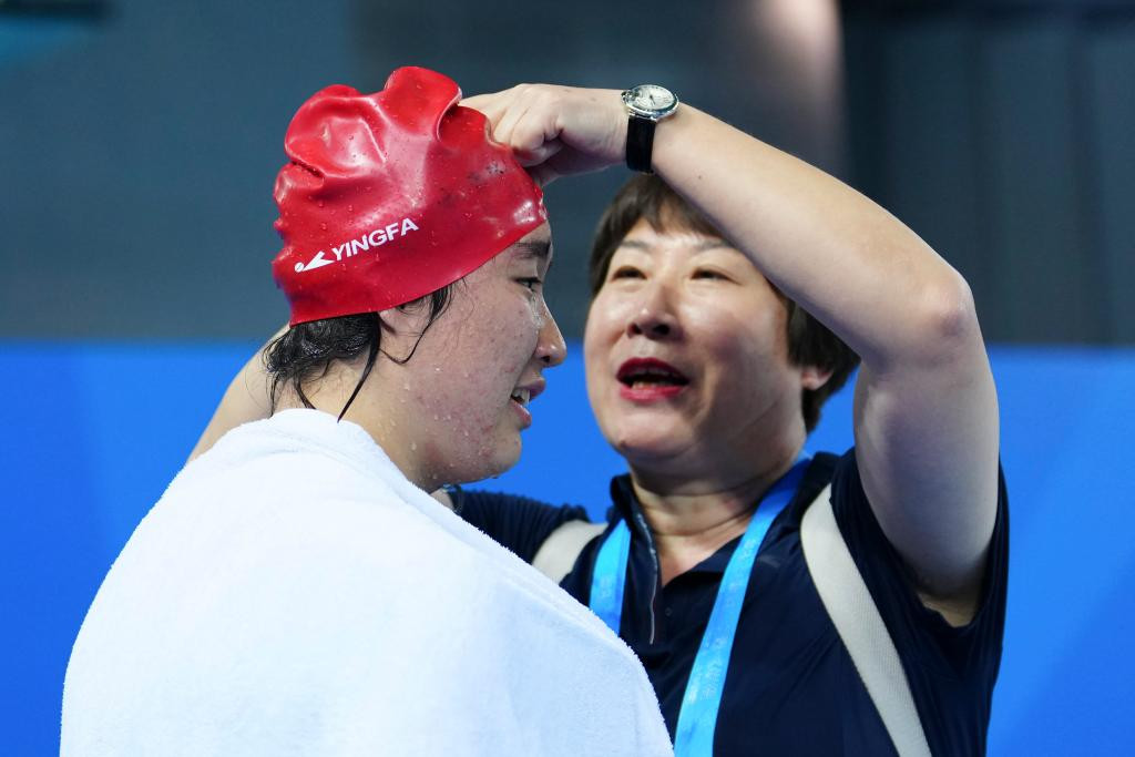 12月13日,教练在女子16-21岁组200米自由泳决赛第3组比赛结束后帮助云南队选手马晨曦(左)摘泳帽。她获得该组别季军。新华社记者 齐芷玥 摄