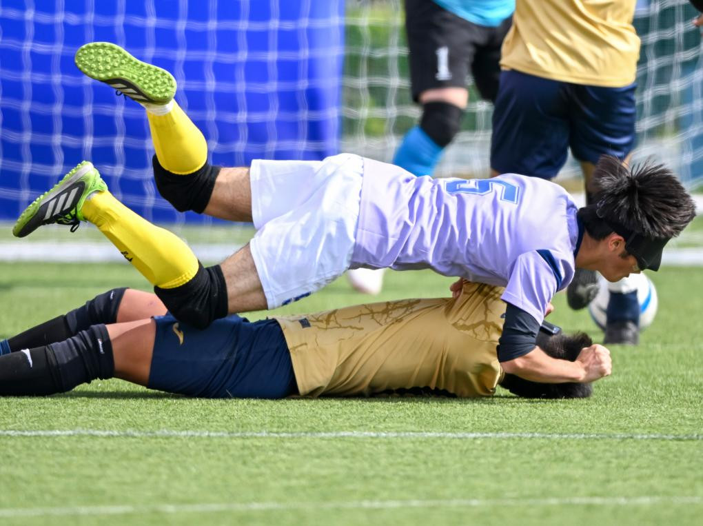 12月14日,在广州举行的全国第十二届残疾人运动会暨第九届特殊奥林匹克运动会盲人足球项目男子组小组赛中,天津队1:0战胜广东二团队。图为天津队球员范海林(上)与广东二团队球员林显晴在拼抢时摔倒。新华社记者 陈浩明 摄
